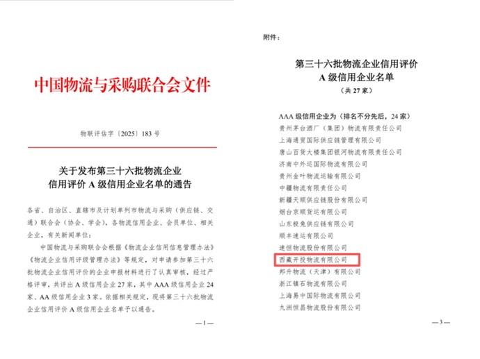 近日,中國物流與采購聯(lián)合會(huì)公布了第三十六批物流企業(yè)信用評(píng)價(jià)A級(jí)信用企業(yè)名單,西藏開投物流有限公司獲評(píng)“AAA級(jí)信用企業(yè)”。